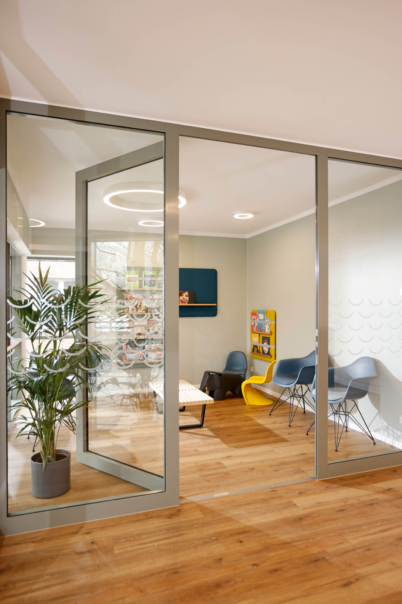 Unsere hellen, modernen Praxisräume mit persönlichem Flair schaffen ein Ambiente zum Wohlfühlen. Im großzügigen Wartebereich genießen Sie den Blick ins Grüne und profitieren von einer kurzen Wartezeit. Für unsere kleinen Patient*innen gibt es einen liebevoll gestalteten Kinderbereich, während bequeme Sitzmöglichkeiten und abwechslungsreiche Zeitschriften das Ankommen erleichtern.